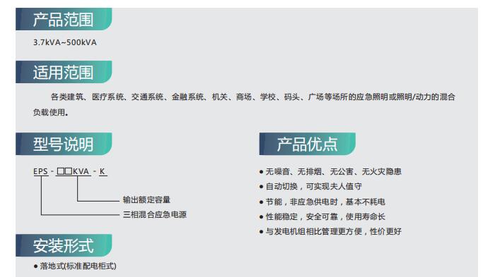 .当市电正常时,由市电经过互投装置给负载供电,同时充电器给备用电池进行智能充电。当市电断电(或超过正常电压的25%时),由控制器提供逆变信号,启动逆变电源,同时互投装置将立即投切.EPS应急电源为一级负荷消防设施/消防应急照明或其它负荷等各种380V/220V用电电器与设备提供应急供电。